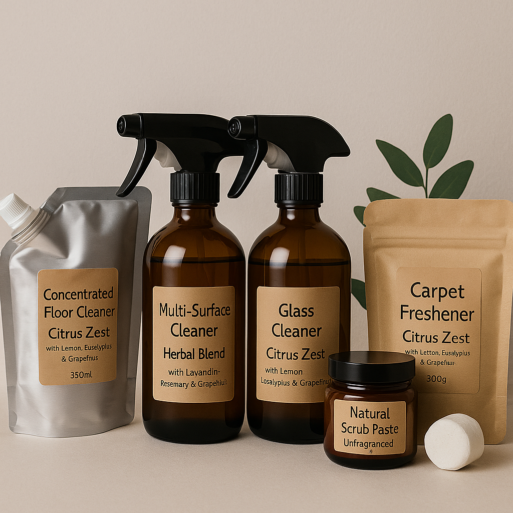 Our Natural Cleaning Collection is handmade with eco-friendly ingredients, gentle on the planet but tough on grime. From fizzing toilet bombs to concentrated floor cleaners and refillable sprays, each product is crafted to keep your home sparkling clean — without harsh chemicals or plastic waste.