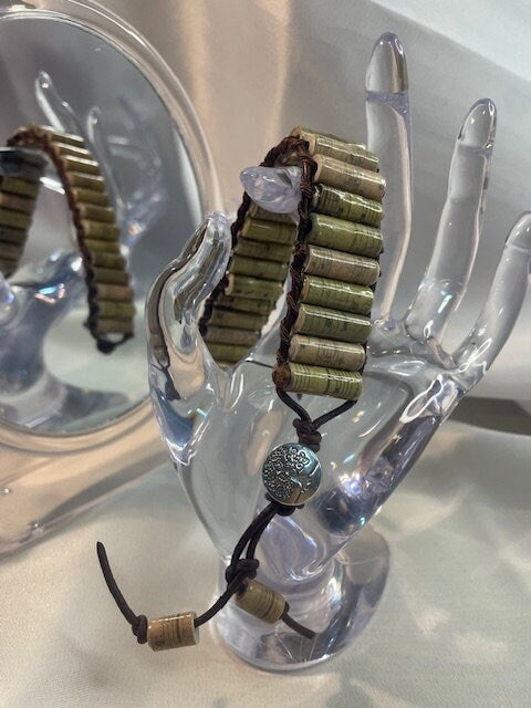 Melody of Nature: Handcrafted Paper Bead Bracelet with Music Note Paper, Brown Leather Cord, and Tree of Life Button