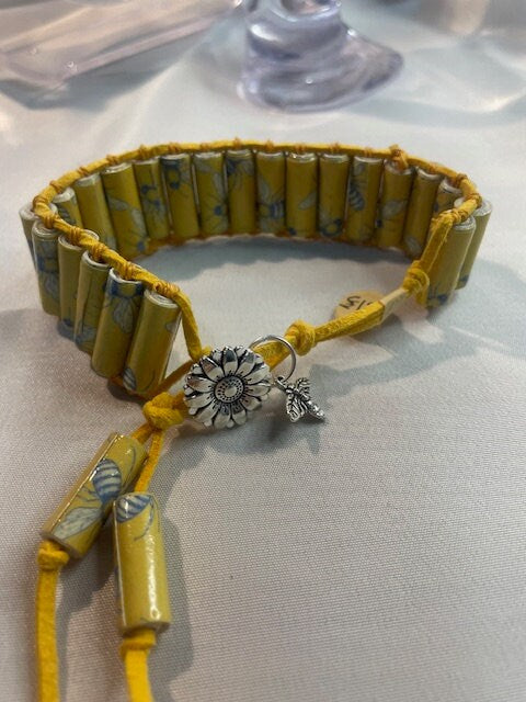 Bee Harmony: Handmade Paper Bead Bracelet with Yellow Suede Cord and Charming Bee Accents